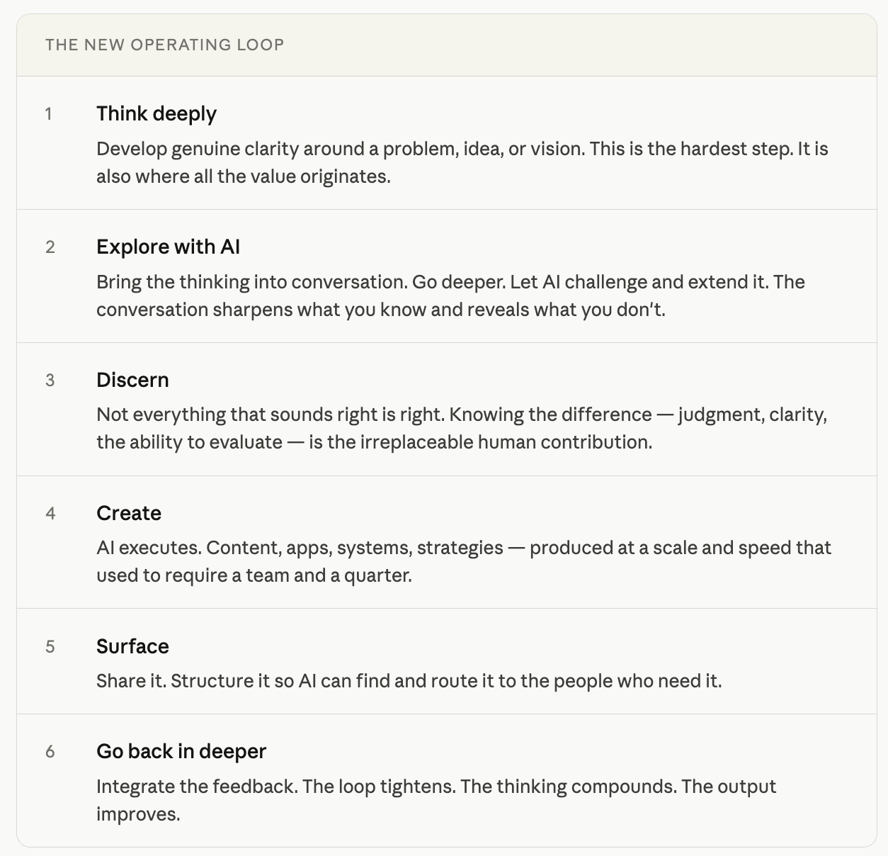 The constraint in this world is not execution — AI handles that. It is not distribution — the platform handles that. The only constraint that remains, the only thing that determines the quality of everything that comes out the other side, is the depth and clarity of what you bring into the conversation.